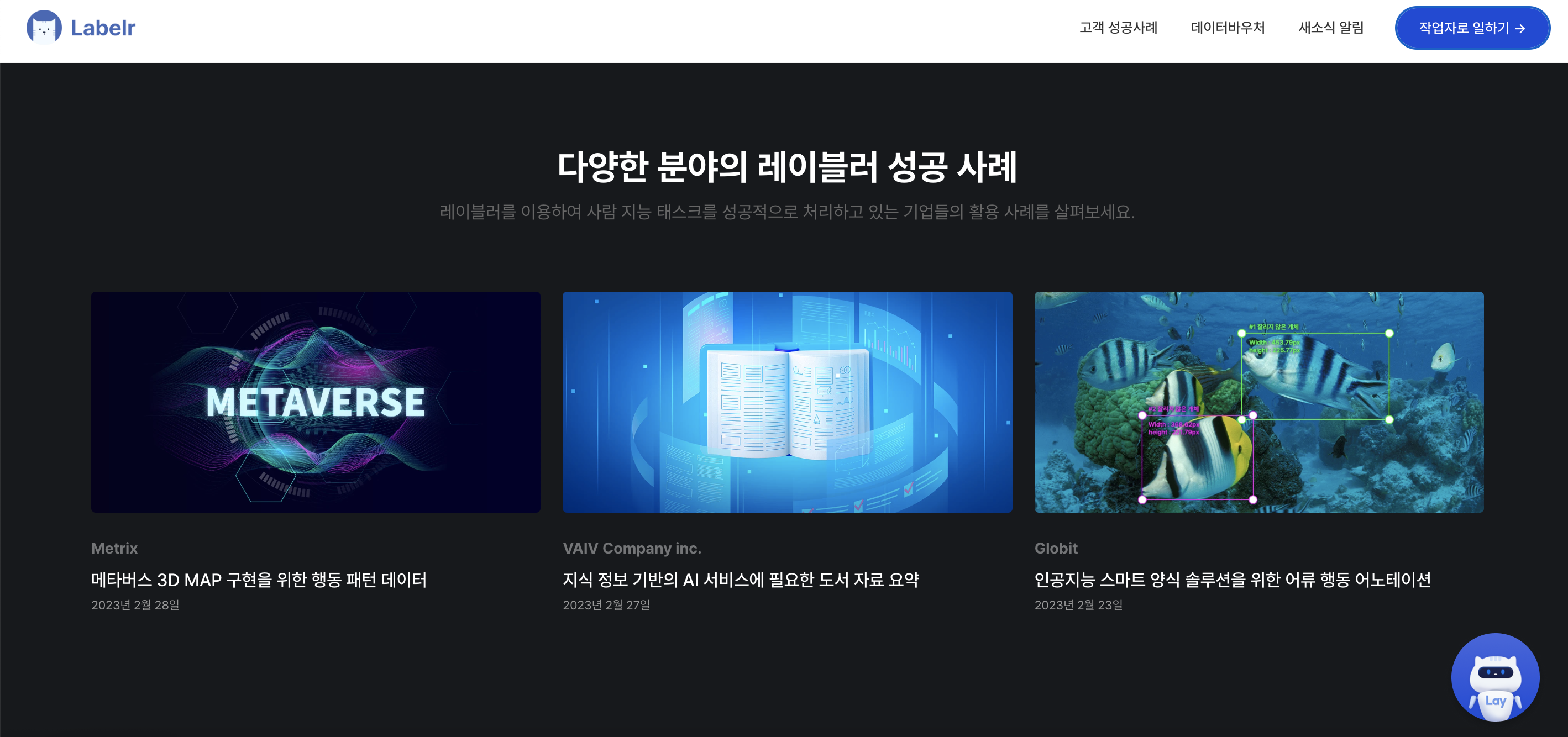 데이터 라벨링 교육부터 실습, 자격증 취득, 프로젝트 참여까지 한번에 확인이 가능한 국대 최대 데이터 라벨링 플랫폼입니다. 활동중인 라벨러 503,489명, 작업데이터 221,937,404건의 거대한 플랫폼으로 교육을 수강하고 나면 해당 레벨?에 맞는 프로젝트들을 지원할 수 있는 채용공고까지 확인할 수 있어 편리합니다.