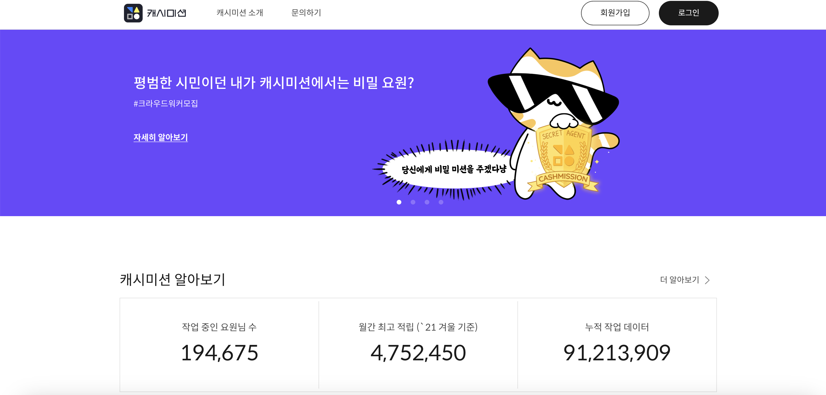 캐시미션은 모바일 이용이 편리하게 구성되어 있어 언제 어디서나 누구나 참여가 쉽도록 구성된 데이터 라벨링 사이트입니다. 작업중인 요원수 194,675명 누적데이터 91,213,909건을 기록중으로 게임을 하듯 미션을 수행하면 현금화가 가능한 리워드를 받을 수 있습니다.