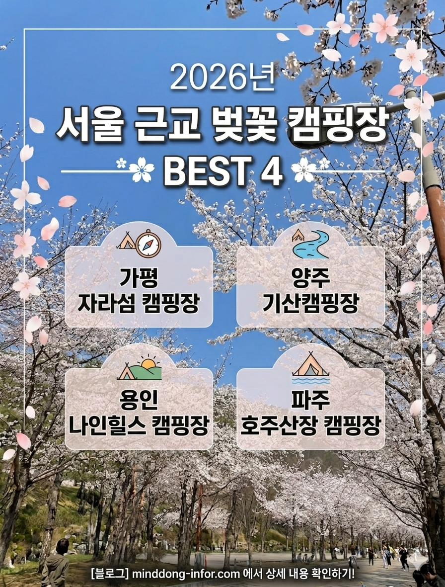 따뜻한 봄바람이 불어오면 캠퍼들의 마음은 설레기 마련입니다. 특히 흩날리는 벚꽃 아래서 즐기는 '벚꽃 캠핑'은 일 년 중 단 몇 주만 허락되는 특별한 경험인데요. 오늘은 서울에서 1~2시간 내외로 떠날 수 있는 경기도 인근 벚꽃 캠핑 명소 4곳을 엄선하여 소개해 드립니다.