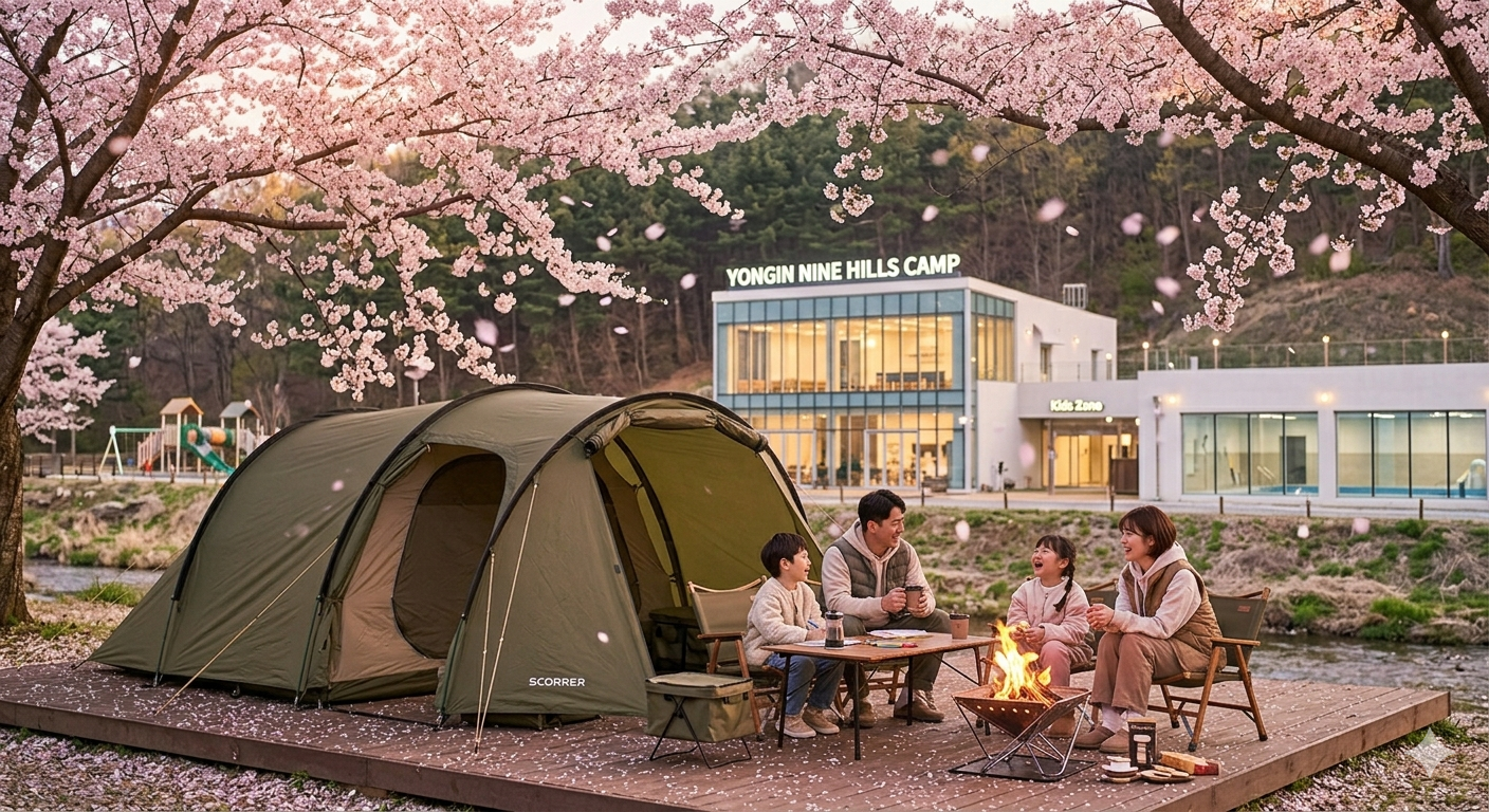 아이와 함께하는 벚꽃 캠핑을 계획하신다면 용인 나인힐스가 정답입니다. 캠핑장 입구부터 핑크빛 벚꽃 길이 반겨주며, 실내 수영장과 대형 놀이방 등 키즈 시설이 호텔급으로 갖춰져 있습니다.